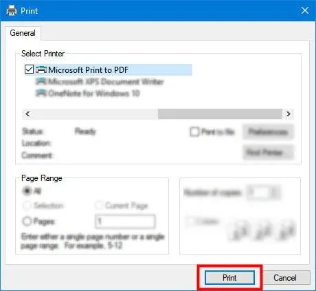 - Pada jendela opsi printer pilih Microsoft Print to PDF di bawah Select Printer .